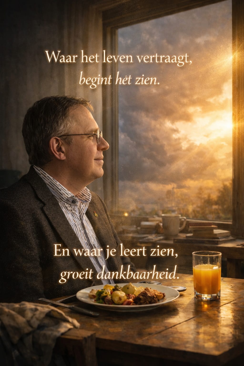 Hoewel ik na bijna 12,5 jaar. Parkinson gestopt ben oorzaken te vinden doe je dat stiekem toch. In plaats van een lekker bordje witlof met ham en kaas werd onze zoon blijer van de opdracht een pizza in de oven te zetten. Geen verse sinasappelsap... Geen opgeruimd huis als moeders thuiskomt... Vandaag een dag met weinig variatie en doelmatigheid.... Uhm... Gaat het leven om doelmatigheid en actie? Of genieten van het zogenaamde "kleine mooie". Genieten van schijnbaar kleine dingen die je op een foto niet ziet, maar kleur blijken te hebben als het leven vertraagt... Dankbaar zijn om een betekenisvol gesprekje in plaats van een artikel.. Dankbaar zijn met het grote-kleine,... Verwonderd zijn met geschenken die je mag leren zien en ontvangen. En leren negeren van alles wat je daarvan afhoudt... ..